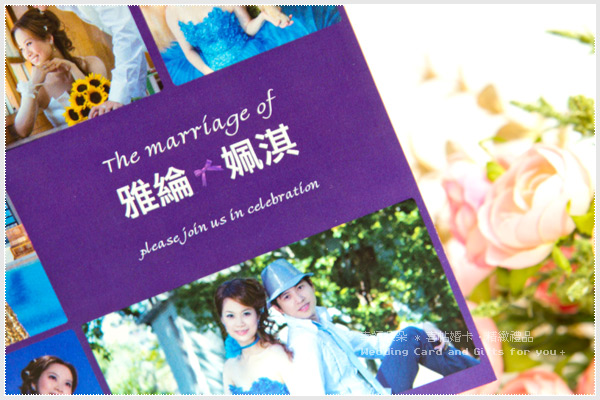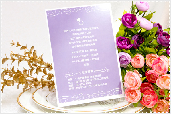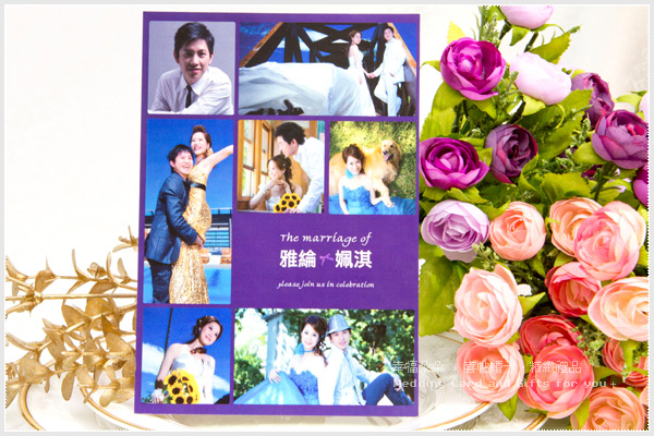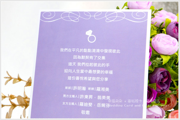 市面少見的紫色系婚卡,背面淡雅風格搭配古典花邊,更具浪漫唯美之感。