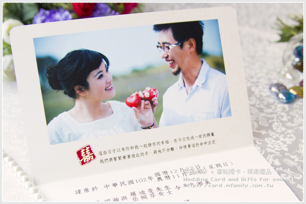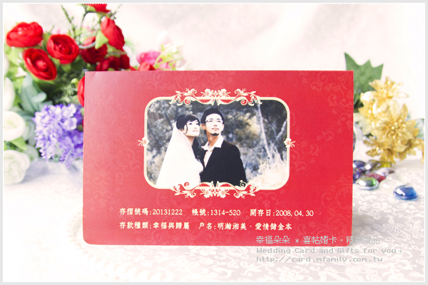 我們送給彼此的禮物是幸福的儲蓄 讓我們的愛能夠永遠記住 每一個幸褔的篇章 *此款喜帖可放上 1 張您們的婚紗照噢~( *註一) |