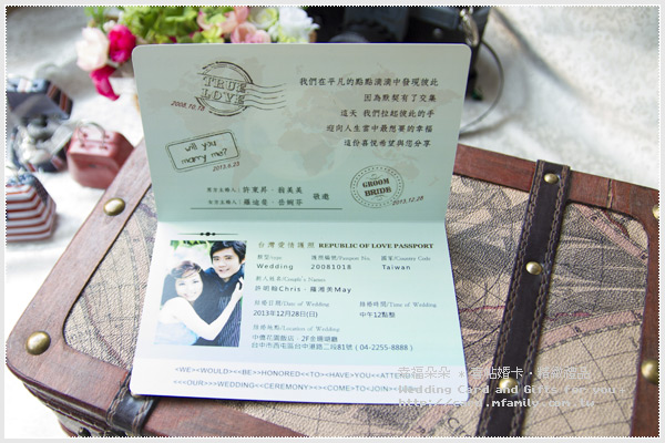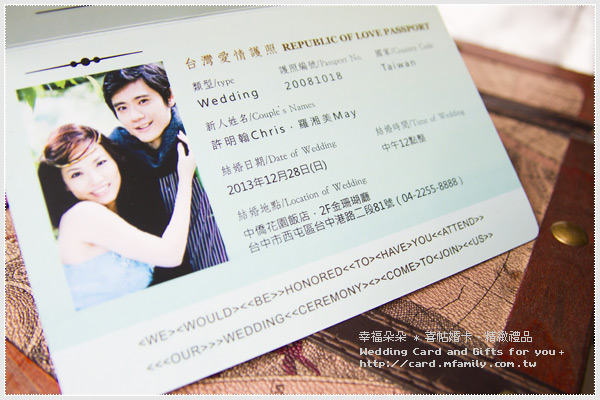 真的要開始了 這場幸福之旅 不一樣的生命 走在同樣的生活 你就住在我心裡 我會一直愛你 給賓客一個最特別的婚卡 見證您們幸福之旅的啟程 *此款喜帖可放上 2 張您們的婚紗照噢~( *註一) |