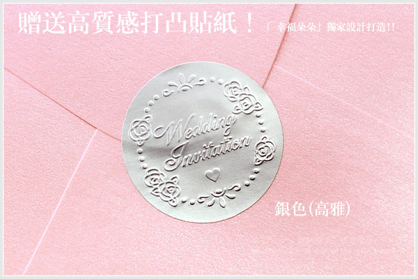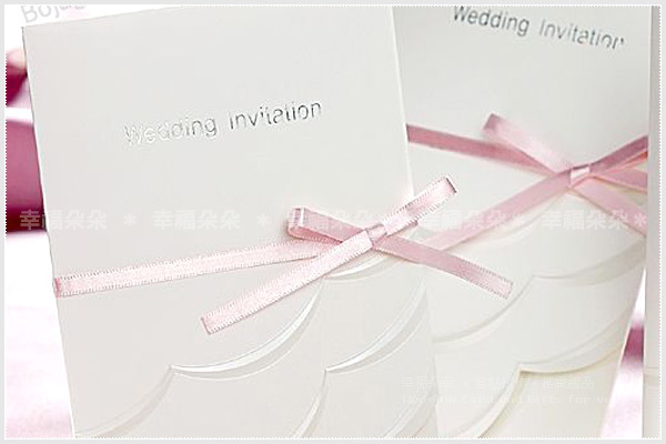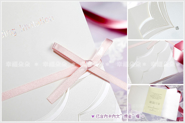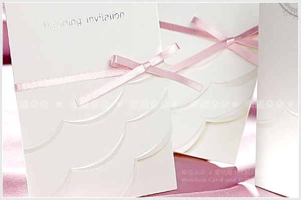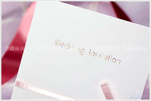 淡淡的、優雅的氣質,值得細細感受。韓國設計師獨殊三摺式設計,上方留白處巧妙安排Wedding Invitation字樣,打開來呼應封面做法,表現白紗圖樣─心有所屬的結婚嫁紗是一生一次特別的美麗,整體以粉紅色緞帶裝飾更顯典雅。Designed in Korea。