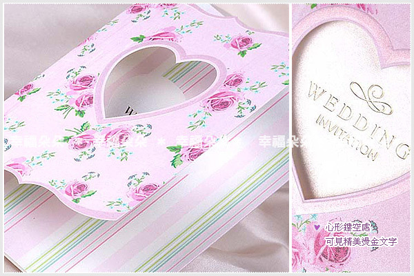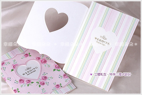 玫瑰一向是愛情最浪漫的代表,經由韓國設計師獨特三摺式設計,中央以愛心鏤空透出WEDDING INVITATION燙金文字,清楚表達婚宴邀請之意,簡潔大方。並以進口炫光紙印製,質感極佳,金屬光澤展現出高級感,適合浪漫又高品味的您。Designed in Korea。
