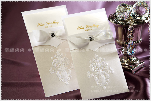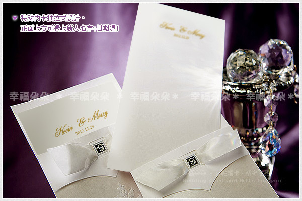 由韓國設計師操刀,純白潔淨的婚卡,彷彿訴說著我們的戀情,單純而專注,典雅的緞帶交織猶如婚禮的交響樂曲在耳邊響起,我要昭告天下~你就是我今生的新娘(郎)。特殊卡套設計,內卡屬抽出方式觀閱。Designed in Korea。