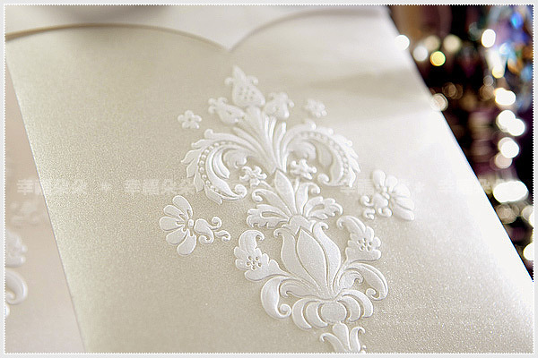 進口紙炫光紙+局部壓凸+手工緞帶