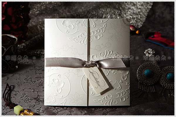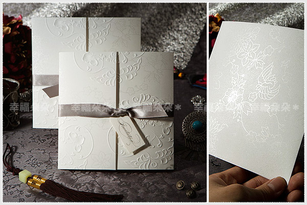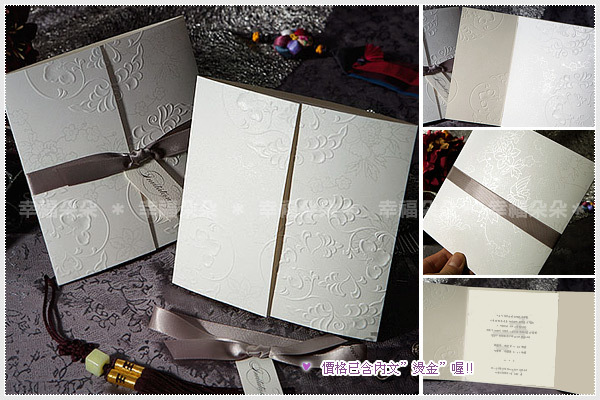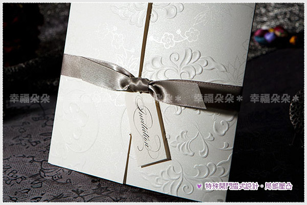 由韓國設計師操刀,運用特殊左右開門摺式設計、以緞帶套起並綁製特殊Invitation字樣小卡,搭配時尚米白及米黃色彩,並運用大塊面紋飾壓凸及特別銀色印製,極具時尚感並帶有淡淡中國風,非常值得珍藏。Designed in Korea。