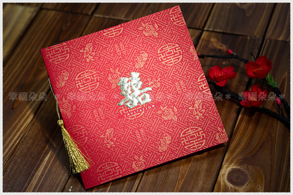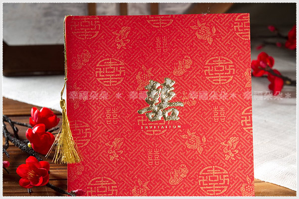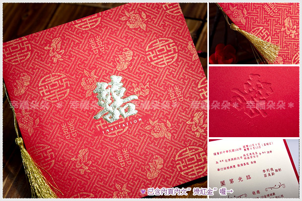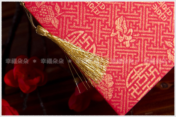 中國風紅卡+燙上金色囍字,非常搶眼及喜氣,並以特殊色印刷底紋,帶有低調的奢華感,左方的金色流蘇更讓整張婚卡帶有濃濃東方味。Designed in Korea。