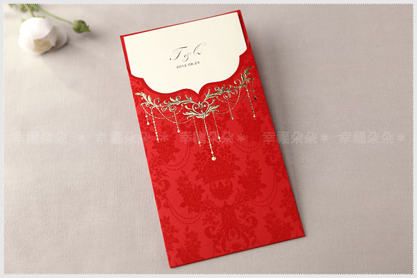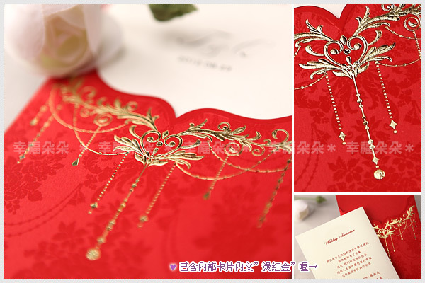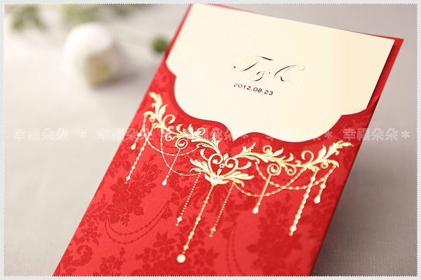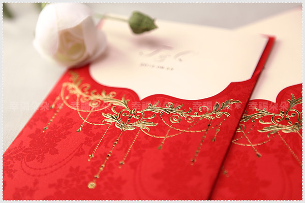 以典雅之吊燈紋飾為視覺焦點,並以燙金手法呈現bling bling閃亮的尊貴感。結合中國風紅色系做設計,特殊的卡套式設計,典雅大方,不同以往喜帖型式,具有時尚的獨特性。Designed in Korea。