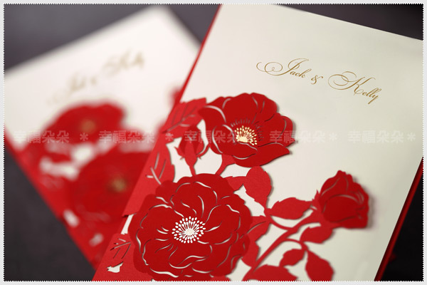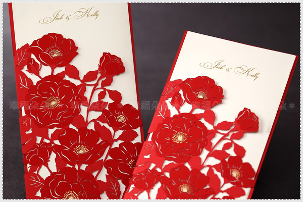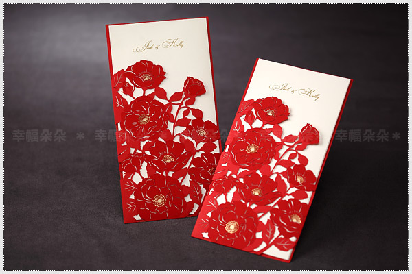 「花團錦簇、歌詠喜訊」為本婚卡設計原意,精緻的雷射雕刻將花朵雕得栩栩如生,局部點綴燙金更呈現與眾不同之尊貴感。特殊的卡套式設計,抽出即可看到邀請內文,簡潔大方。Designed in Korea。