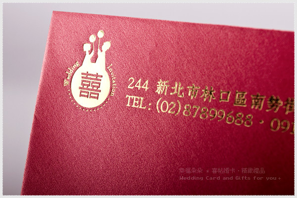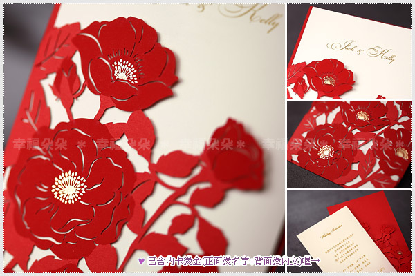 進口紅卡紙+雷射雕刻+局部燙金、內文採燙金方式直燙內部米色卡片上(含正面上方姓名燙金+背面內文燙金)