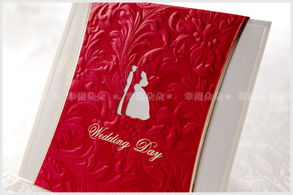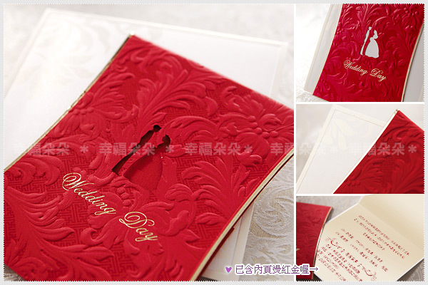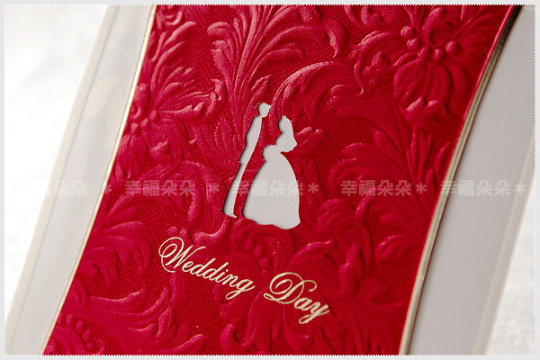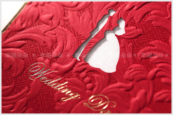 運用特殊鏤空新人卡套設計、搭配喜氣紅色,突破傳統婚卡格局。紅色底紋更使用打凸方式展現不凡質感,並燙上「Wedding Day」文字簡潔呈現邀約之意。巧妙運用襯底方式,抽出即可看到邀請內文,是具有趣味效果的特別婚卡。Designed in Korea。