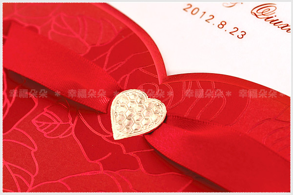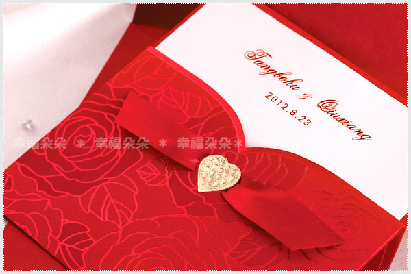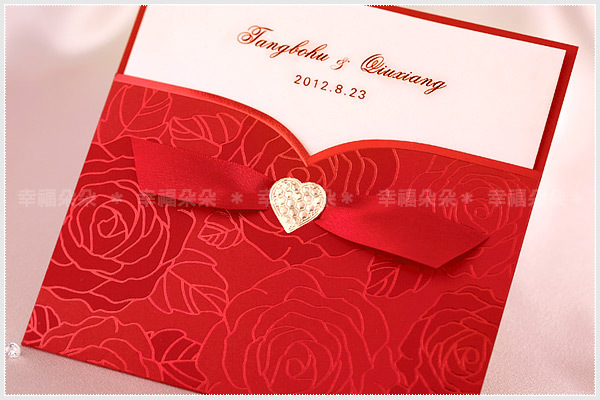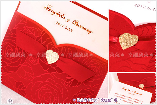設計上以朵朵玫瑰為主題,火紅的紅色相當喜氣喔,特別的插卡式設計,中間飾以一顆金色愛心及緞帶,拉出卡片即可看到邀請訊息,浪漫典雅,Designed in Korea。