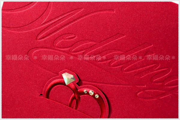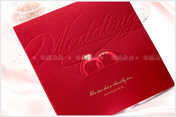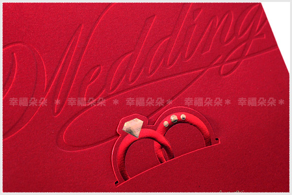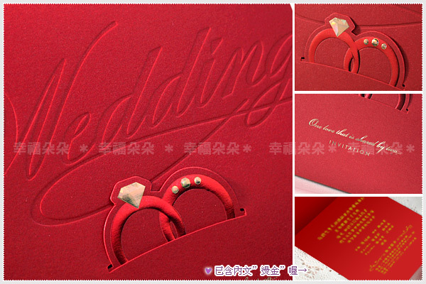 交換婚戒,是你我愛的宣言,是今生最重要的決定。採婚戒圖案軋型設計,搭配紅色星光卡紙非常喜氣。空白處還有Wedding的壓凹文字,增加層次感。三摺崁入式設計,特別凸顯主題,Designed in Korea。