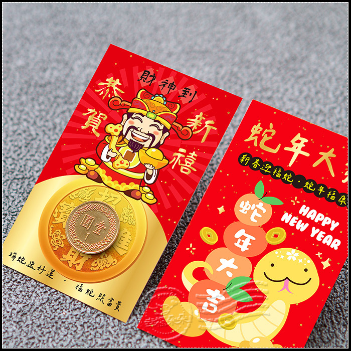 一面是福蛇發財,一面則是財神報喜, 兩面同時擁有,就是要讓您好運連連、發大財😘 每張皆貼有一個1元新台幣並附上opp袋包裝完成