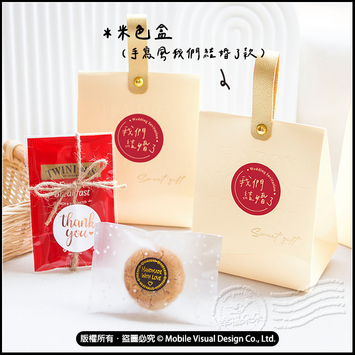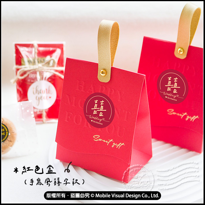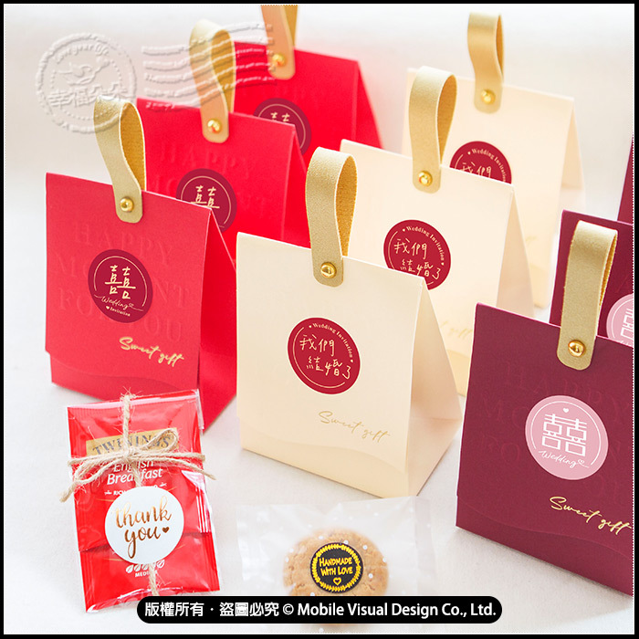 一份小小心意,傳遞最溫暖的感謝。 以典雅囍字設計搭配精緻提把包裝,簡約又喜氣,讓每位賓客都感受到新人滿滿的用心。 囍字象徵新婚喜慶,茶代表溫暖與祝福,餅乾象徵甜蜜與圓滿。 無論是婚禮送客、二進發放或婚禮回禮,都非常適合。 共三款喜糖盒顏色可挑:手寫風囍字款(紅色盒)、設計風囍字款(酒紅色盒)、手寫風我們結婚了(米色盒) 每份喜糖盒內均有:Twinings茶包X2入+桃酥1入 ✔ 喜氣囍字設計,婚禮氛圍滿分 ✔ 精緻手提包裝,小巧可愛好攜帶 ✔ 內含茶點搭配,實用不浪費 ✔ 三種質感配色,婚禮風格百搭 ✔ 適合婚禮、活動、派對小禮物 📌 適用場合 婚禮桌上禮、婚禮回禮 喜宴小禮、婚禮伴手禮 保存方式:存放於乾燥陰涼處即可 保存期限:未開封至少半年以上。